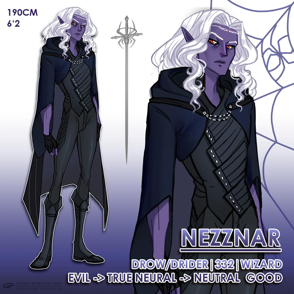 Drow - Nezznar can only appear in his true form of a drow for several hours a day by use of a polymorph spell. When he does he chooses to appear as close to what he remembers his true form to be. He stands as an extraordinarily tall and slender drow at 190cm. Nezznar looks just a little older than a drow his age normally would. He has grey-purple skin, silvery-white wavy hair, graded reaching down to his waist, thinning out at the lower ends.