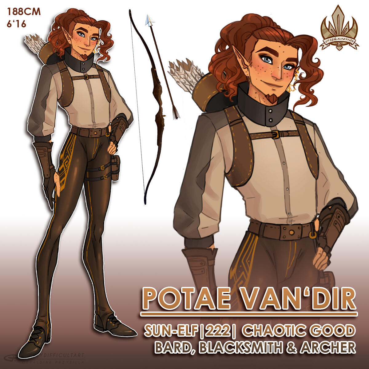 Potae was born in the port city of Waterdeep to his loving Parents Lael and Vulvin Van’dir. Two elves who have left their studies of magic and life on the magical island Everlund behind to spread the fine artisanship of elven smithing on the sword coast.