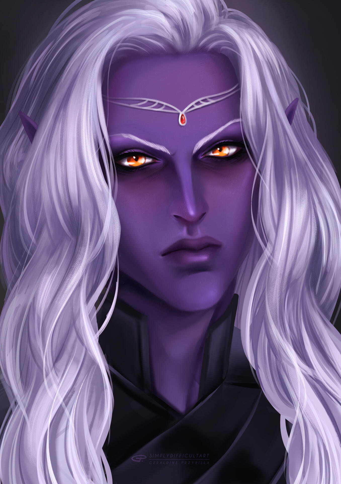 Drow - Nezznar can only appear in his true form of a drow for several hours a day by use of a polymorph spell. When he does he chooses to appear as close to what he remembers his true form to be. He stands as an extraordinarily tall and slender drow at 190cm. Nezznar looks just a little older than a drow his age normally would. He has grey-purple skin, silvery-white wavy hair, graded reaching down to his waist, thinning out at the lower ends.